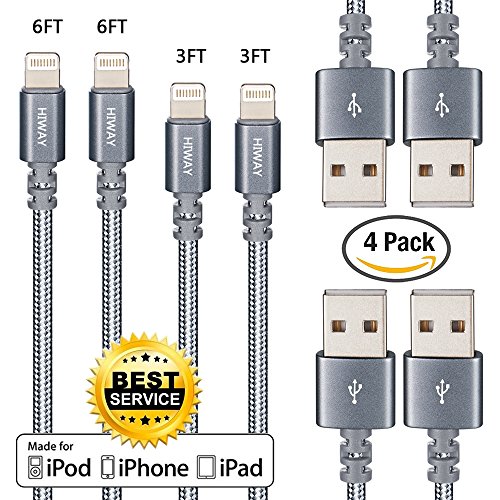 Hiway 4PACK (3FT & 6ft) Nylon Braided Charging Cable Cord Lightning to USB Cable Charger Compatible with iPhone 7/ 7 Plus/6/6s/6 plus/6s plus/ 5s/5c, iPad, iPod and More (grey) - Grey