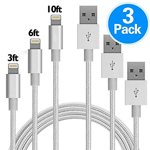 GANJOY iPhone Charger 3Pack 3FT/6FT/10FT(1M/2M/3M) Nylon Braided 8 pin Charging Cables USB Charger Cord, Compatible with iPhone 7/7 Plus/6s/6s Plus/6/6 Plus/5/5S/5C/SE/iPad and iPod - Silver